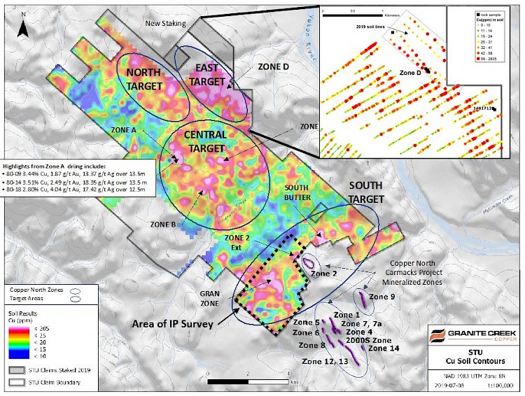 Vancouver, BC, Granite Creek Copper Ltd. (TSX.V: GCX) (“Granite Creek”) announces that the Company has completed its inaugural field exploration campaign at the 100%-owned Stu Copper-Gold Project, located in the Minto Copper Belt of Canada’s Yukon Territory. The project, which was acquired in January 2019, is situated between Copper North’s advanced Carmacks Copper Project to the south and Pembridge Resource’s operational Minto copper mine to the north. Following acquisition of the project, Granite Creek secured and reviewed an extensive, privately held exploration database and, based on those findings, launched the 2019 exploration program which was designed to refine drill targets for an anticipated 2020 campaign. An overview of the program, along with an update on other related initiatives, follows.
