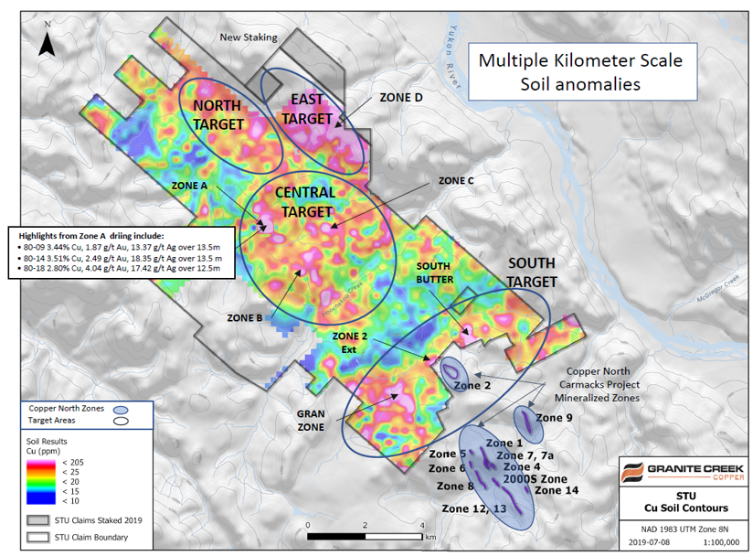 July 15, 2019 - Vancouver, B.C., Granite Creek Copper Ltd. (TSX.V: GCX) (“Granite Creek” or the “Company”) is pleased to provide an update on progress on its 2019 data compilation work at the Stu Copper-Gold Project in the Minto Copper District of Canada’s Yukon Territory. Compilation and initial field work have resulted in the identification four multi-kilometer target areas including the newly identified “East Target” as defined by soil geochemistry.